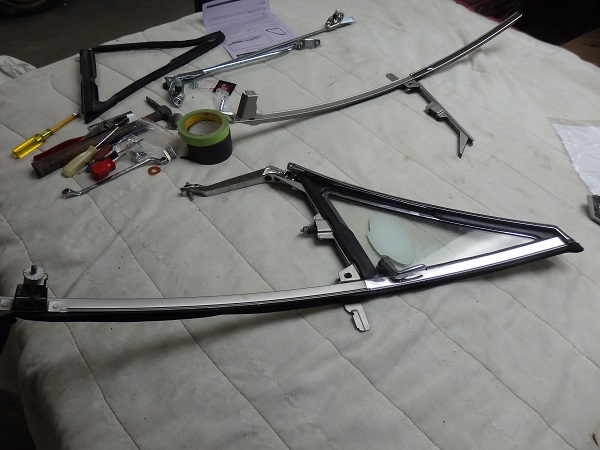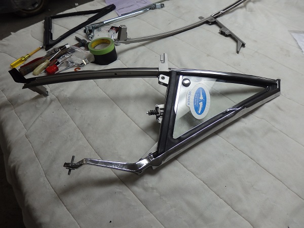 The metal track was sandblatest and painted with Seymour's stainless steel paint.The vent windows were put together with new seals. I decided to leave the originl NHRA decal on the RH vent window, which is the only reminder of