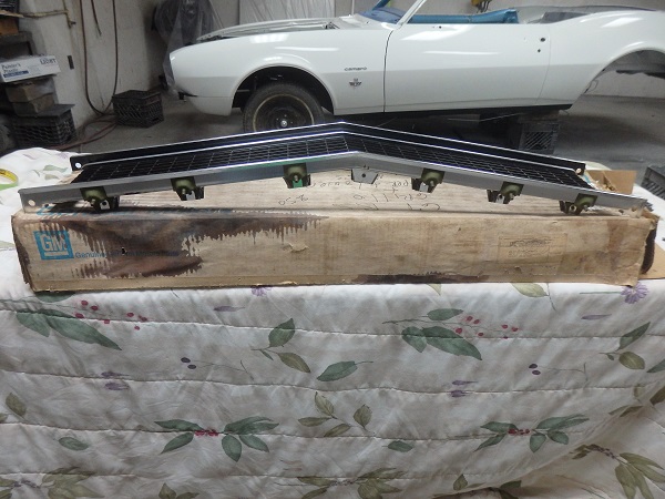 It's a good idea to install a chase wire to the antenna base and run it through the hole in the fender when installing the fender as it is much more difficult later. I was very lucky to find a correct NOS 1967 SS Camaro. It was even shipped in 1967 according to the shipping label. 1968 grills a slightly different, so chasing the correct grill is normally difficult. I was really suprised to find that GM originally riveted the grill to the lower valance using special tubular rivets. I had previously purchased the rather pricey handtool from Hanson Rivet to actually clinch rivets a few projects back. So I just needed to get the rivets from AMK and buy the correct dies from Hanson. Now every time I look at a 67 Camaro at a show I look to see if the grill is riveted to the lower valance. Not many........ The grill is bolted to the upper panel. Clips (green) that are a part of the grill assembly mate to holes in the upper panel. Once the grill is installed, you set the upper panel in place and use nuts from the inside to attach it too the grill. |