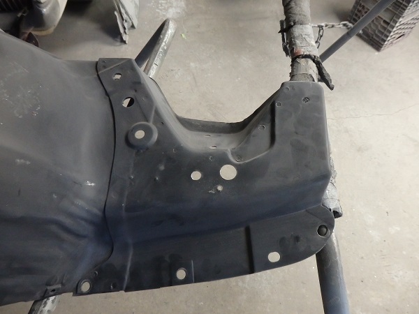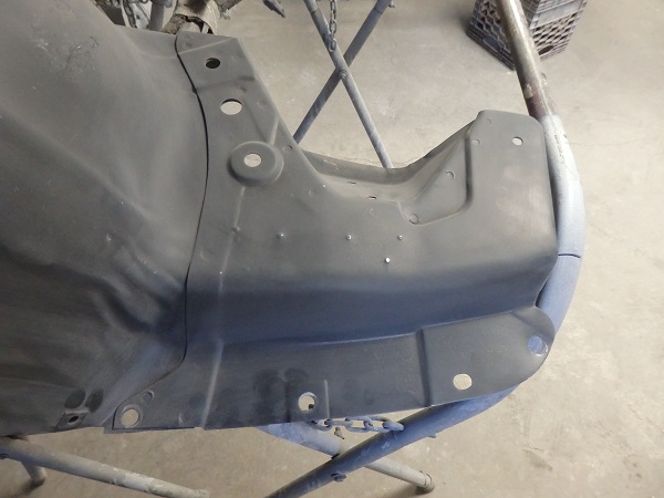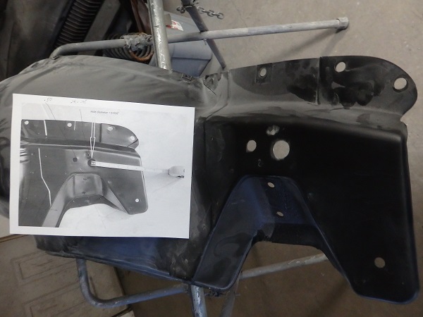 I got an excellent pair of front inner fenders from my trip to Camaro Specialties, though it took a lot of digging through the bad ones to find ones that weren't rusted with holes. Once I got them home I had them sandblasted and then I primed them with DP90LF black epoxy primer. In 1967, inner fenders were the same for standard headlight cars and hideaway headlight RS cars. The factory drilled out holes in the standard ones for the front parking light plug and ground wires that are used on hideaway headlight cars. There are 3 dimples in the inner fenders to locate the holes and the factory assembly manual shows you what size to drill them. In my case, I found some good pictures on the web, printed them out and marked them with the proper dimensions. With the holes drilled, I painted the inner fenders Hot Rod Black. |