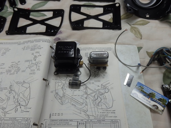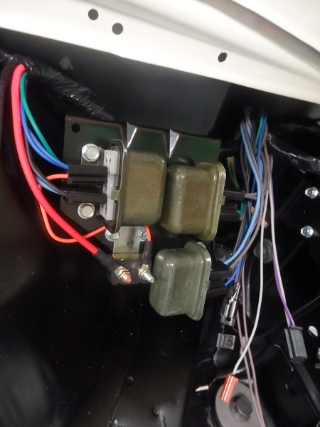 The nose (less the hood) actually assembled pretty fast, even though I did it without any help. This is because I had the car pre-assembled when I blocked it and I kept the shims separate and marked them with their locations, so everything went back together with the same alignment without much fuss. Though I did use masking tape to protect the edges of the panels from hitting during alignment. Note: Original shims were phosphate coated, so those bright zinc repos stick out.... I was able to locate a good used horn relay and a good used voltage regulator, both with the proper date codes for the car. For the hideaway headlights, I just bought a new relay set as they are tucked up into the fenders where they are not seen and because I didn't want to have to deal with bad relays caused damage to the headlight motors. |
