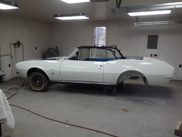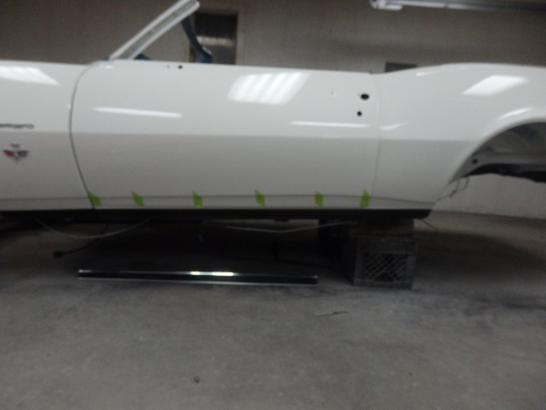 Here I am drilling out the holes and installing the side moldings that go on RS cars. I bought templates and placed tape in the locations where the holes go before marking and drilling the holes. The repo moldings for the doors were a real pain to install. The clips kept rotating and coming off. The moldings are great, but the clips are just horrible. |