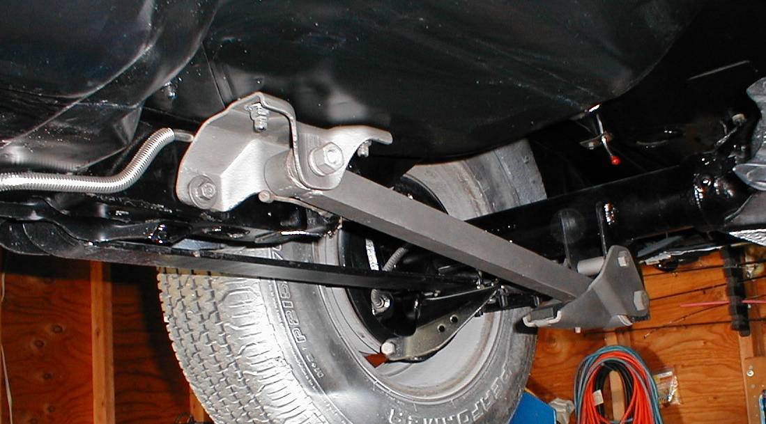 ![]() The Camaro did not have staggered shocks in 1967. That coupled with a monoleaf spring design resulted in wheel-hop during initial take off. Chevy resolved this, kind of, by adding a traction bar. The early cars had round radius rods and the later ones had square radius rods. In this picture that I stole from Camaros.org you can see how it is mounted. I will have to replace the photo with one form my car when I get a chance...... |