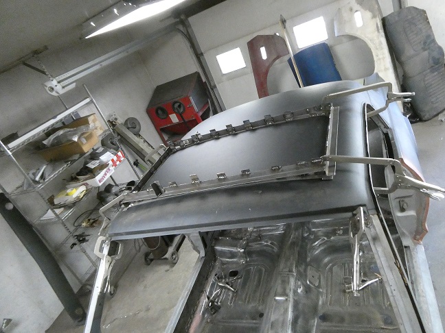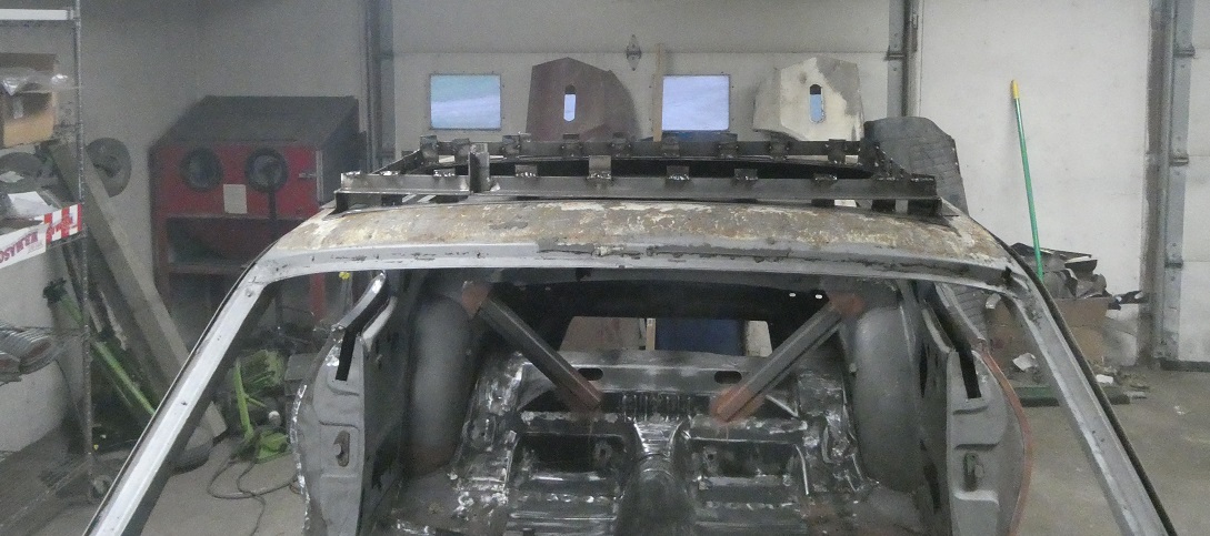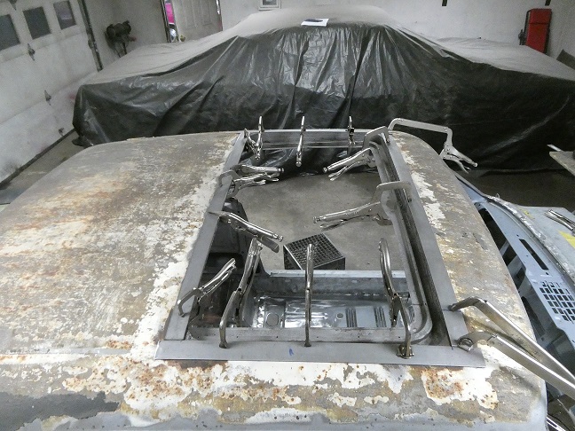 With the jig made, I was able to completely remove the roof skin. This exposed the metal frame that ASC added to the car.