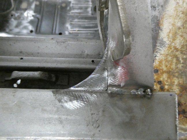 The inside corners of the sunroof opening are curved. I made 4 filler pieces properly curved as to be even with the inside face of the opening. Once satisfied with the shape, I chamfered the straight faces, to form a V-groove and welded them to