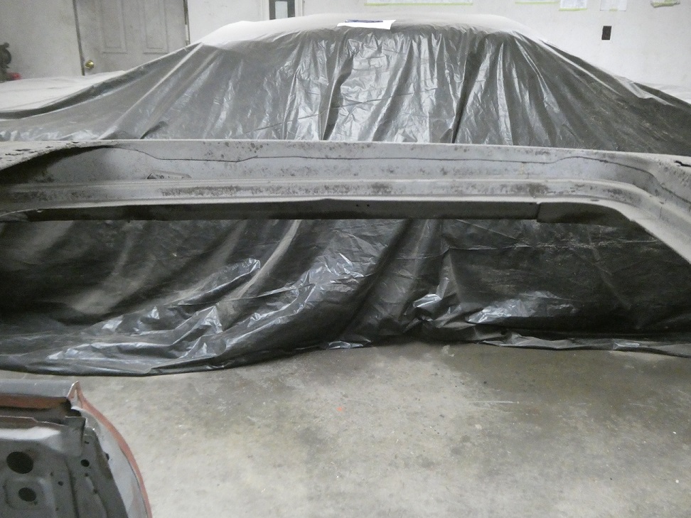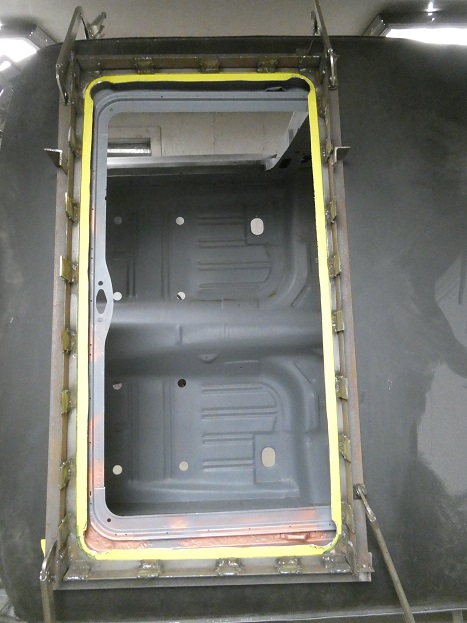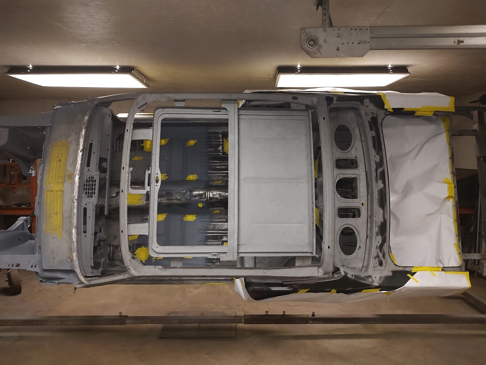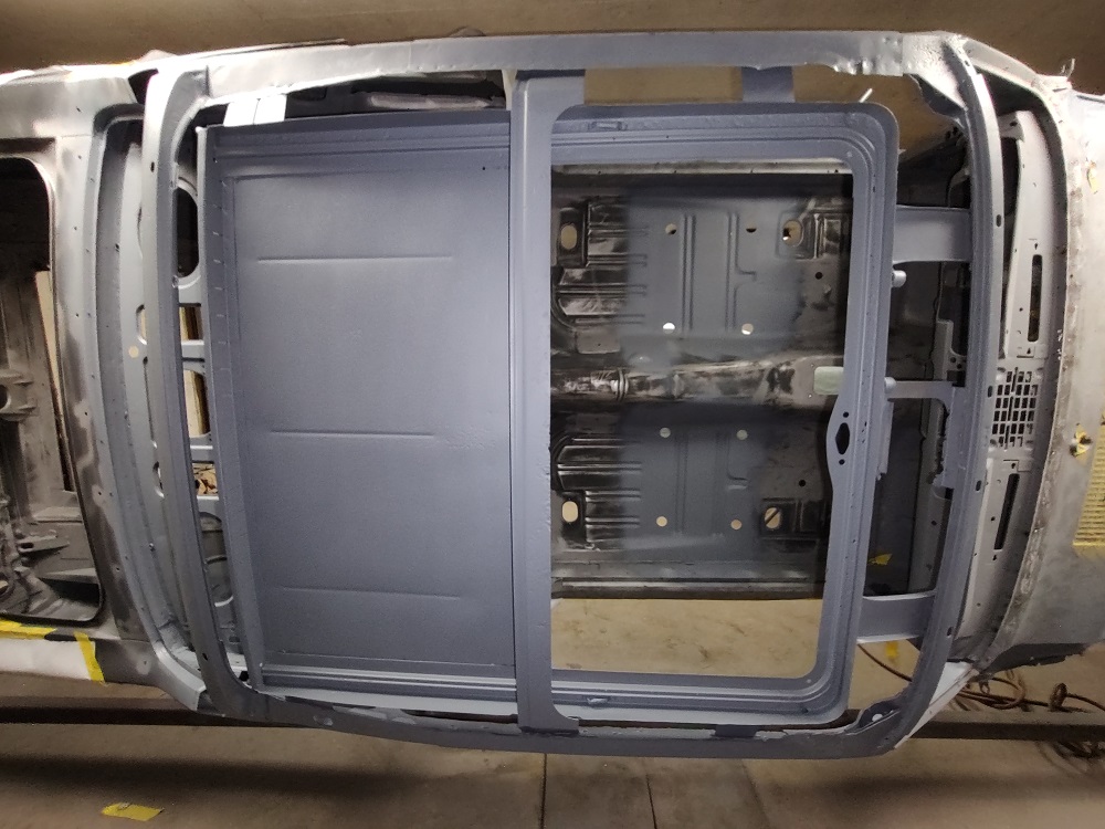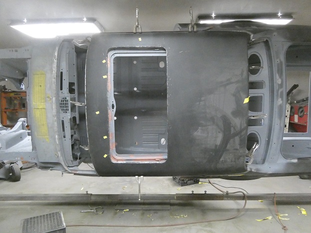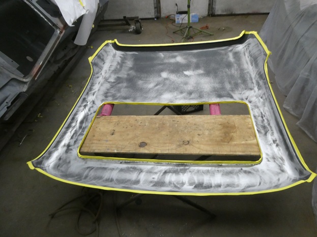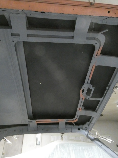 The next step was to sandblast and epoxy prime the inner roof structure with several coats of DP50LF. In subsequent pictures you may notice some copper colored patchy areas. Sandblasting the rusty sunroof channels had produced a few