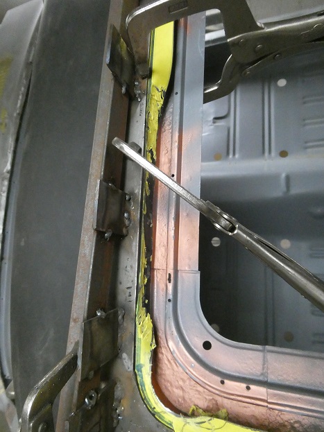 With the roof skin back in place, I finished folding over the roof skin at the rear sunroof inner reinforcement. This is just like installing a door skin. I folded the metal over with wide vicegrips and hammered and dollied it flat followed