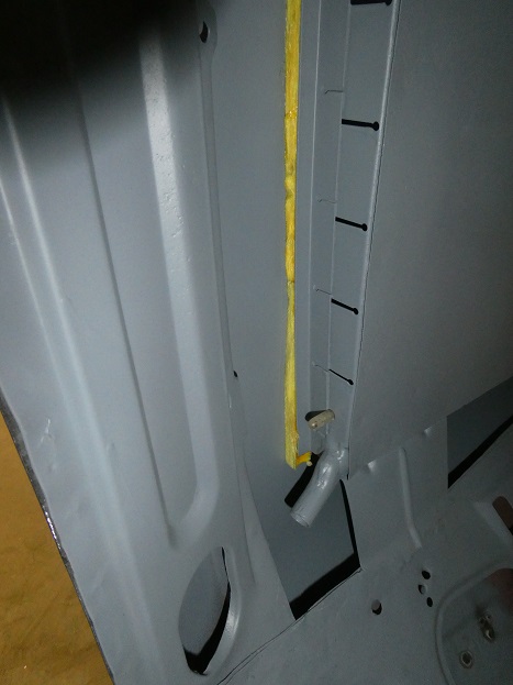Before putting the roof skin back on I installed the sunroof bumpers and a new insulation strip across the rear sunroof frame. The insulation strip was made from a piece of pipe insulation the I bought at Home Depot. It had the same correct color and density as the original strip