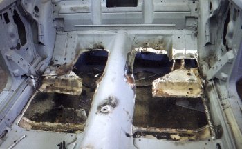 and trimmed and with the cuts carefully marked on the floorpan before cutting.In this picture the floor is cut and the edges were being prepared for the new pieces. |