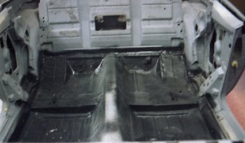 good coat of a quality rubberized undercoating was used to coat the entire floor. The new trunk pan was installed in much the same fassion. Undercoating was not and should not be used on the trunk pan. |