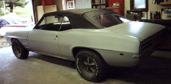 At this point it is the perfect time to install the new convertible top. I did this myself. The process involves bolting and unbolting the lower tack strip several times. To prevent damaging the paint the top should be installed prior to the final prime and paint. Here it is right after it was primed with a two part epoxy primer.