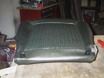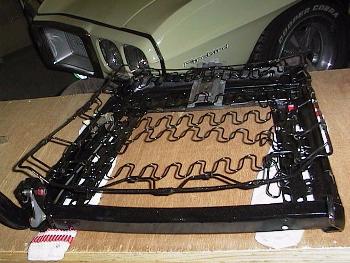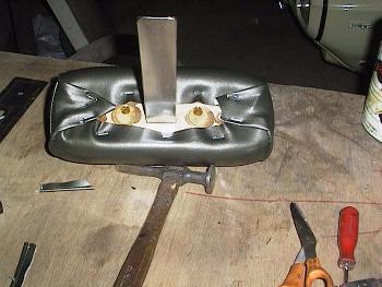 Here is the right front seat base with new cloth, the boarder padding and the wire tiedown installed.