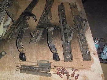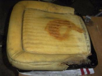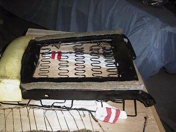 Here is the remaining seat springs. You may notice at the right is the metal bracket that the seat back latches to. I needed to apply heat to the mounting screws to get them out. But I could not do it without setting the seat foam on fire. So I had to do it last.