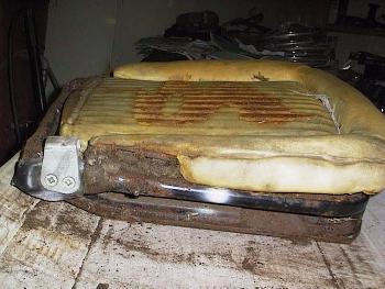 Removing the seat bun reveals a cloth cover that is used to keep the seat springs from cutting into the seat bun. Hogringed around the perimeter of the seat frame is a padding material that keeps the edge of the spring frame from digging into the seat bun and fabric. It has to be removed very carefully. Its very easy to tare apart. Hogringed on top off all of that is a paper wrapped wire that is used to tiedown the center section of the seat upholstery. It is very important to note exactly where this goes or the seat upholstery will not fit right.