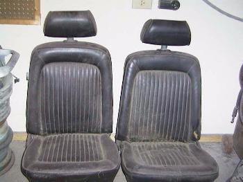 The original front seats were missing, but I was able to locate a pair for $100 in a local salvage yard. Here's a picture of them when I got them home. Since these were black and my interior is going to be dark ivy gold, I had to buy new covers. This isn't really a big problem since I probably would have had to reupholster the originals anyway. There are some other pieces on the seats that are supposed to be dark ivy gold that can't be bought new: hinge covers, headrest bezel and headrest plate. I was able to locate some original dark ivy gold parts and a real good set of seat tracks from a Want Ad I had posted at the Vintage-Mustang Forum