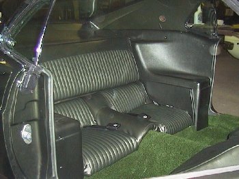 Then the rear set back was installed. I gave it a fresh coat of charcoal metallic paint before it was installed. This car has a fixed rear seat. The upper rear seat is smaller on than the seat back by about 3/4 of an inch on each end. So its important to paint both sides of the seat back charcoal metallic.