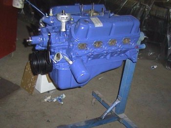 Here it is all painted. I used Plasti-Kote Ford Blue #224. The engine is a darker blue than the picture shows. Notice that I've installed the emissions decal and some of the brackets and distributor.