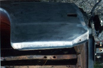 Here is a view of the lower rear section. On the previous page I omitted a discussion about this area, mainly because I didn't have a picture. This is a dead giveaway that the quarters have been changed. Thisrecessed area is not reproduced in the repo quarters. I had to make this section for both sides myself using the rusted out section as a template. I was lucky enough to have the back section, where the rear valance panel is attached, still intact. Though I could reproduce it, this area needs to be correct so that the valance fits correctly.