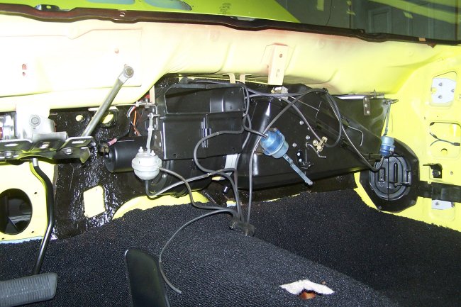 Next comes the a/c heater box and ducts. Note: the carpet is not properly set in this picture.