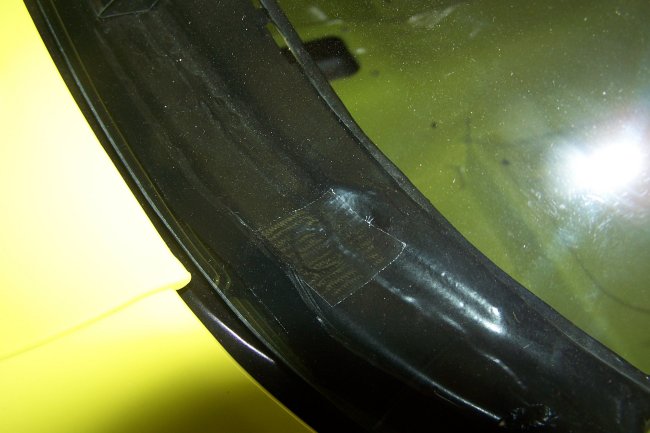 Here are the repos installed. I used a bead of gray strip caulk as a sealer. At this point I installed black duct tape in the locations where Ford had put tape on this car. Ford used a 3" wide tape