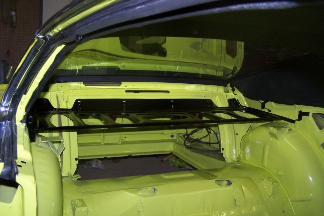 rear seat reenforcement in place using the upper stop brackets. Once that is done, I put the rear seat trim caps on. Note: All of these trim parts are painted charcoal grey metallic on black