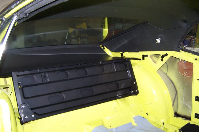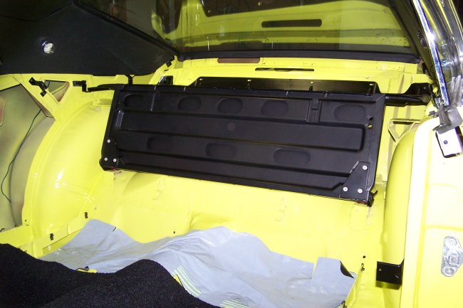 Next goes in the package tray board. As with many cars the original one was warped beyond use. Repos, like this one, are available. They still need to be trimmed and painted.