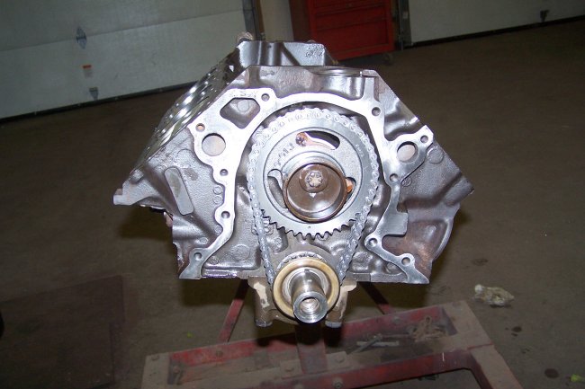 The next thing to go on was cam and the timing gears. The lobes of the cam care coated with a special grease to help it break-in easier. In this picture the oil baffle is alread installed on the