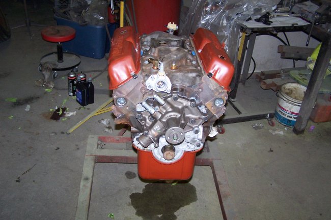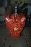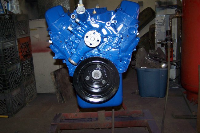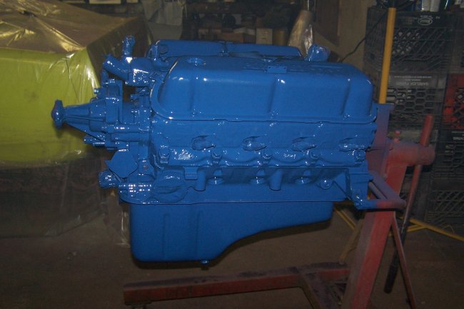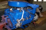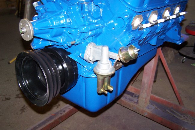 Here's the engine with everthing installed, except the dipstick tube. The waterpump is a rebuilt original. The rear vacuum tree, the temp sending unit, the water neck and the thermo vacuum switch