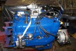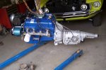 The fun part was mating the transmission to the engine. Though not shown very well in this picture, the transmission dipstick tube is a bright green, poppy green. The MCA judging rules state that the tube should be black, but from what I've see