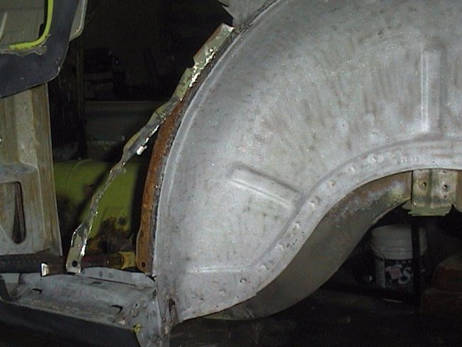 The outer wheel well is pinch-welded to the inner along the entire length of the standing seam. The best way to deal with this is used the pneumatic reciprocating saw to cut off as much off the outer wheel