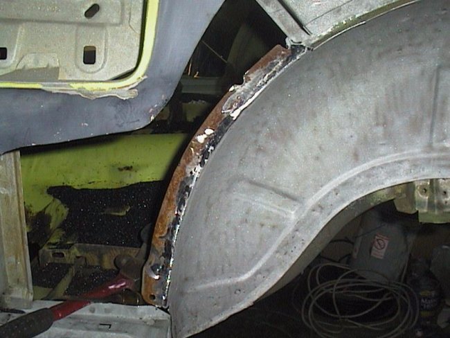 When the outer wheel well is removed from the rocker panel it is not uncommon to uncover a rust hole. This hole can usually be seen from inside the car in the back seat area before the outer wheel well