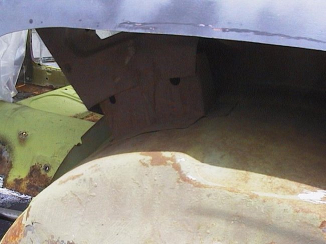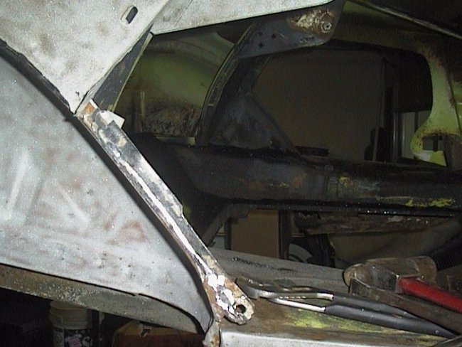 the brace to achieve an original appearance from within the trunk (see below). Here a first pass has been made with the stone grinder to grind down the pinch weld. Then the piece of the outer wheel well is pried away from