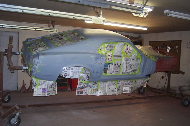 of the car that will be painted body color later. The first step was to cover all openings with masking tape as seen here. The next step was to cover the rest with newspaper.