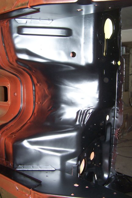 Here is the section of the original floorpan that I was refering to earlier. You can see the original primer color along with the factory overspray. A good restoration should involve reproducing this overspray even though it is not pretty.