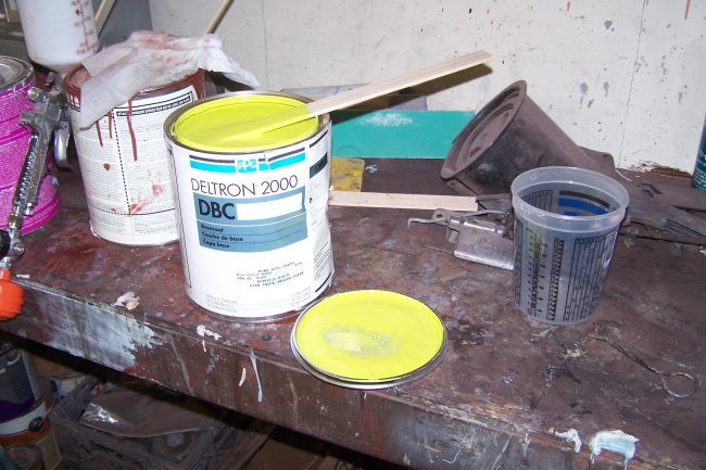 Now its time to paint. Here is a gallon of Groovy Green paint. Today Ford calls the color Ford Firetruck Yellow Green. Paint is not cheap it cost me $275 for the gallon plus another $150 for the clear, reducer and hardener.