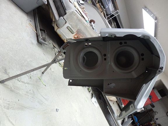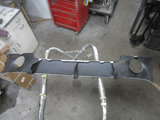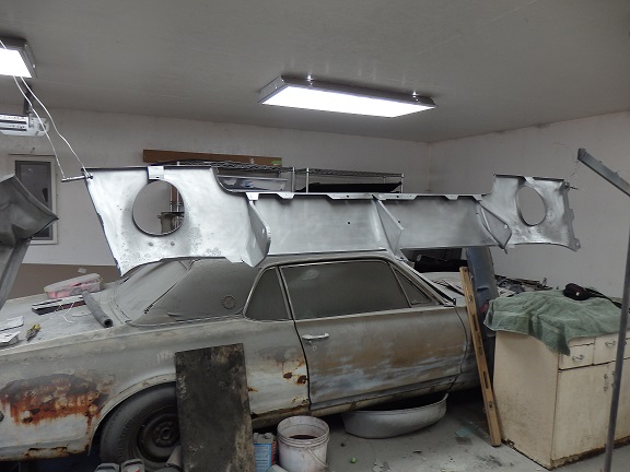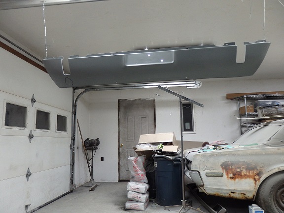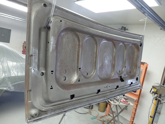 197) In this picture you can see the trunklid hung from the ceiling. This is how I performed all of the repairs on the underside. It was the best way to manage the seam repairs.
