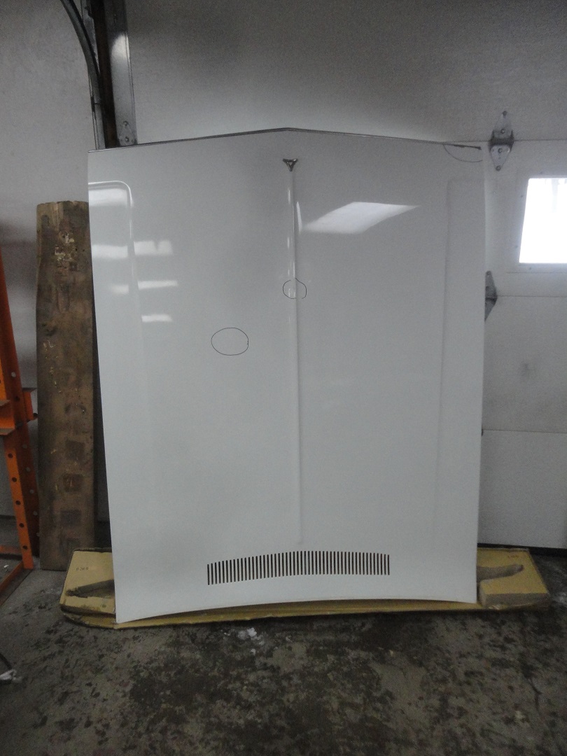 187) Here's the hood a got off from E-bay. It is a correct early 1970 Hood without crumple zones. I paid $228 for the hood and $162 to have it shipped from Florida to Vermont. The body shop that I got it from converted a 1970 to a performance hood. So they shipped me the old hood in the packaging the performance hood came in. I had it shipped FedEX Freight. I was suprised to find an original set of early 1970 hood hinges in the box when I got it. My original ones where bent. Early hoods not only had no crumple zones, but also used 5/16" bolts to mount them to the hinges.