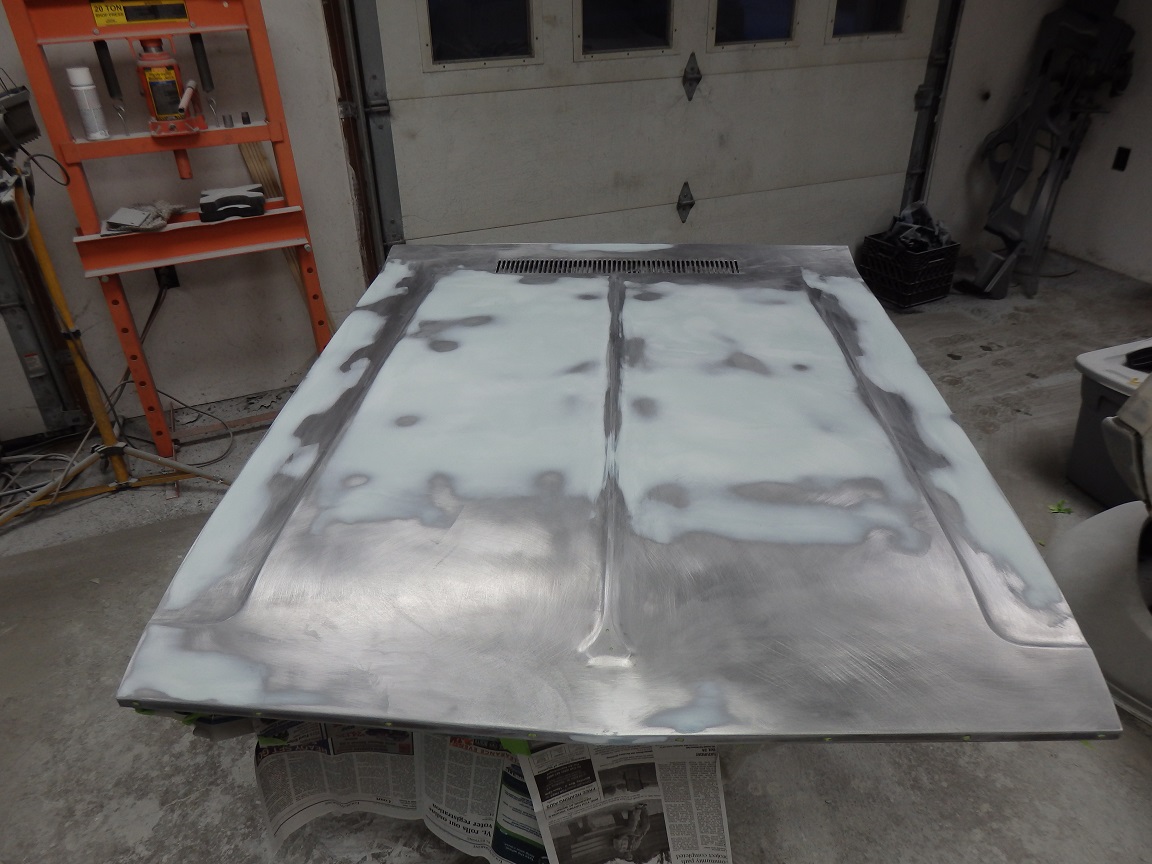 192) The top side of the hood was chemically stripped with Aircraft Paint Stripper. I have yet to see a perfect hood. People who sit on their hoods create a lot of work for people down the road. Though this picture makes the hood look terrible, most of filler was not very thick. I could have skipped most of it and waited for the highbuild primer step to take out the imperfections.