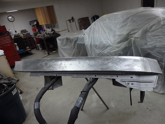194) The trunklid needed a bit of work. The bottom seam was quite rusted on the underside and there was a factory "correction" that needed fixing. In this picture you can see an area, perhaps a foot long, where the metal was heated and folded. This was found under the original paint, which makes this a factory repair. It appears that there was a defect in the panel that they had to heat up and pound down to close the trunk lid all the way. This was easy for me to clean up. I just mig welded along the lenght of it and ground it down.