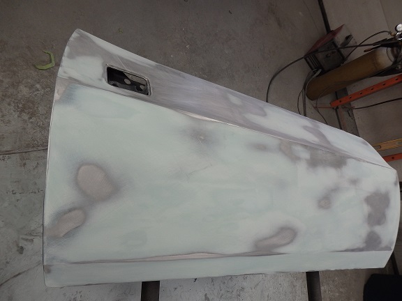 189) On the underside of the hood I masked and sandblasted the inner frame. But for the underside of the outer skin I had to chemically strip to prevent warping due to the sandblaster. I use Aircraft Paint Stripper as my prefered stripper.