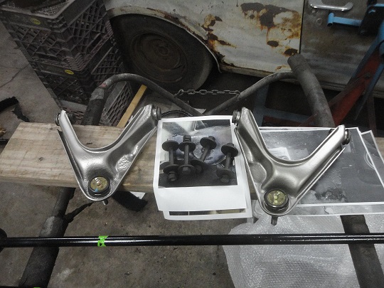 361) The upper control arms were sandblasted, epoxy primed and painted with Seymour Stainless Steel paint. They were then rebuilt using Moog ball joints and bushings. The torsion bars were cleaned up and painted gloss black. The factory
