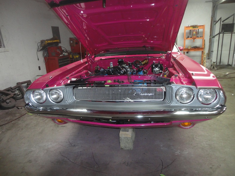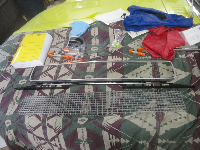 384) I was able to rebuild the grill with new repo pieces that I got from Roseville Moparts. Luckily I had the missing bracket on the original hood latch support.