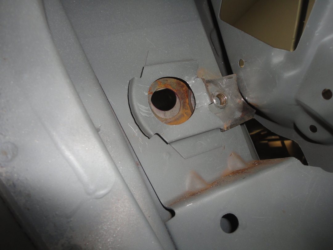 opening for the door latch pin. It was about 3/8" too low. To preserver the original factory spot welds I removed the