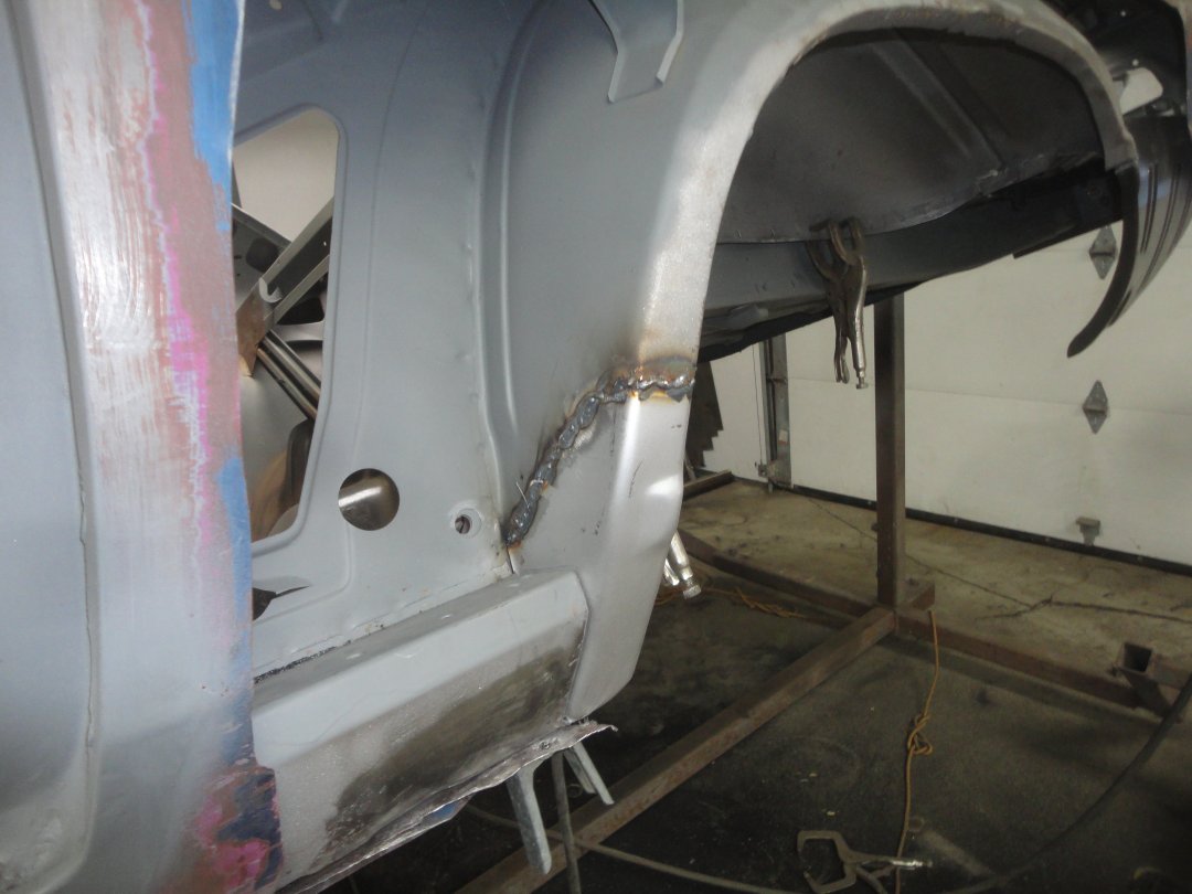 78) For the front patch of the wheel well, I used a section of a new repo panel. Here it is welded in place just before the