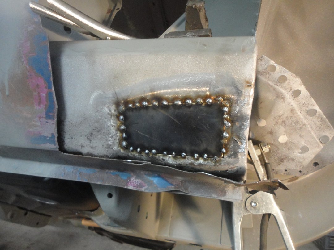 76) I made a new patch and butt-welded it in. In this picture the first round of tack welds were applied.