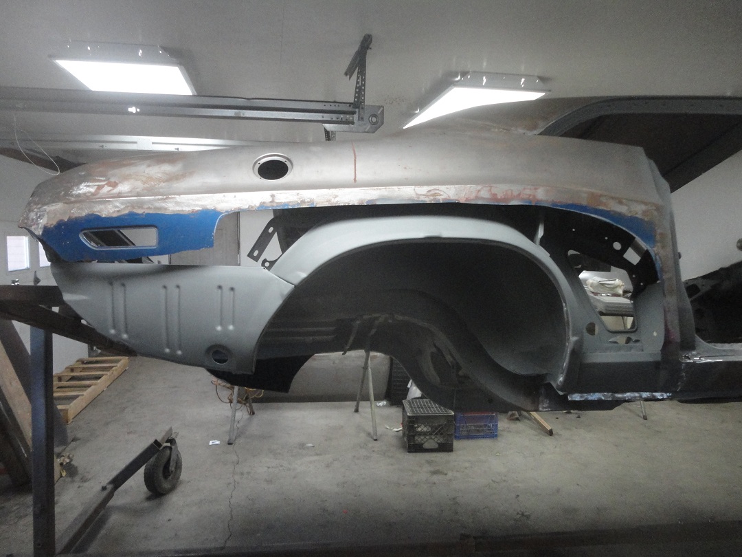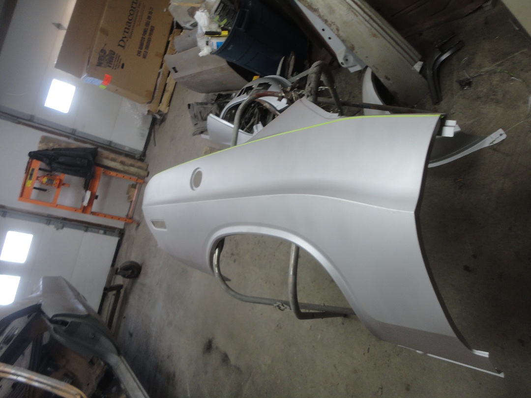 104) Here is a picture of my new Dynacorn rear quarter. The 4 holes for the gas filler were a bit undersized (which I corrected), but
