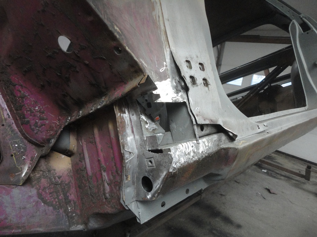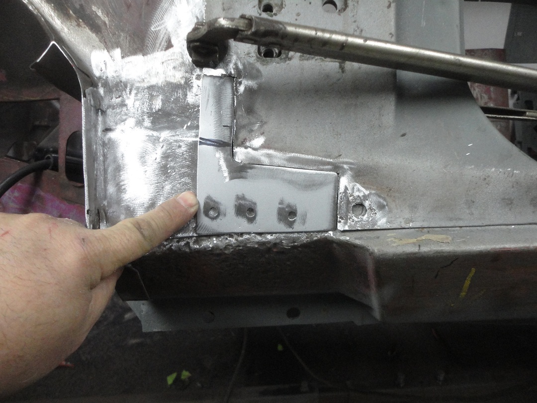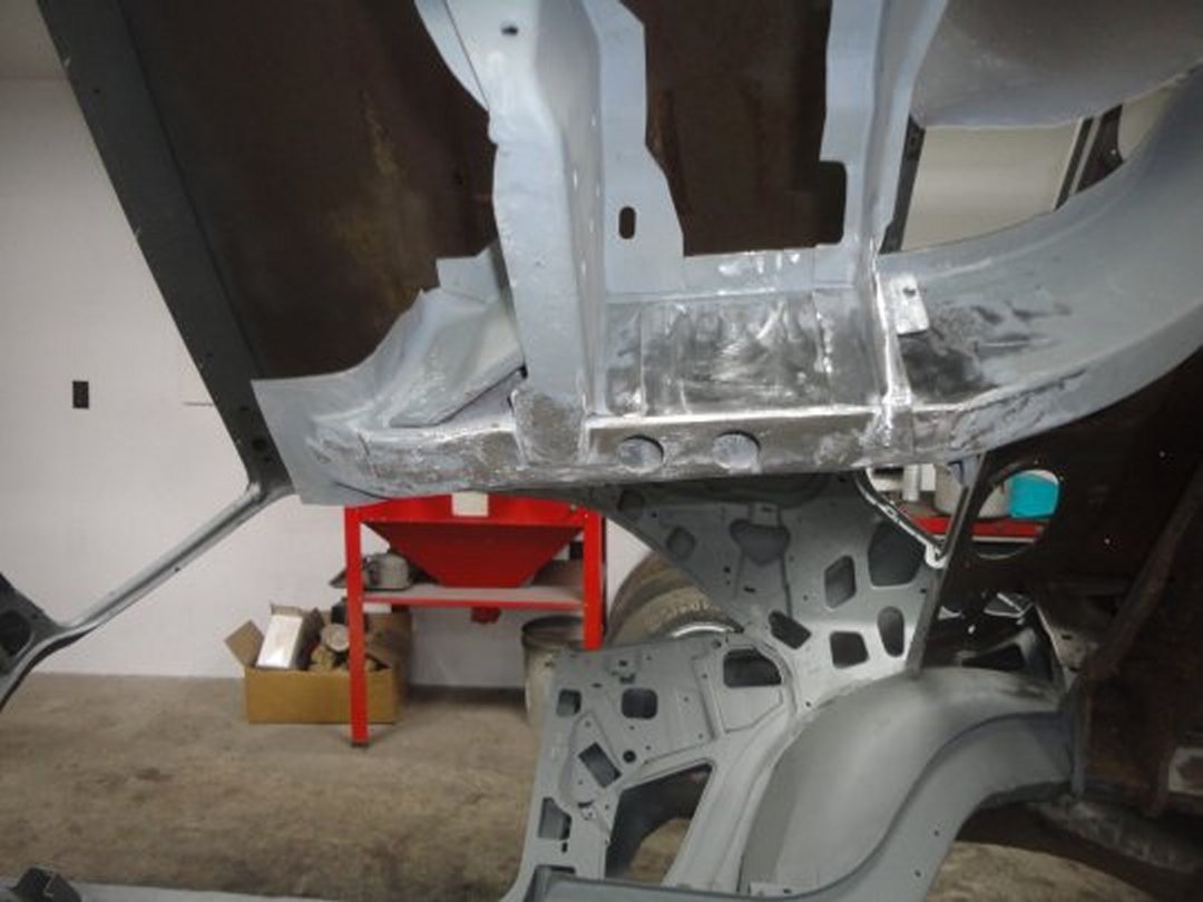 9) The first actual repair was the area shown here on the left rear frame rail. I had to cut part of the rear reenforcement off to get to one