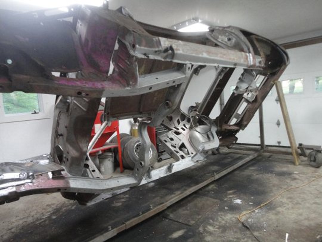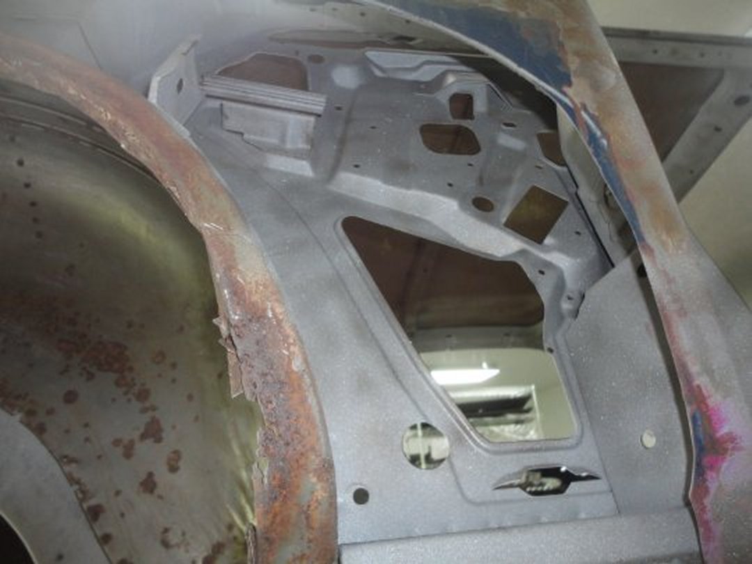 3) I stopped sandblasting at the upper rear crossmember. It is actually quicker to replace the crossmember than to sandblast, prime and fill in