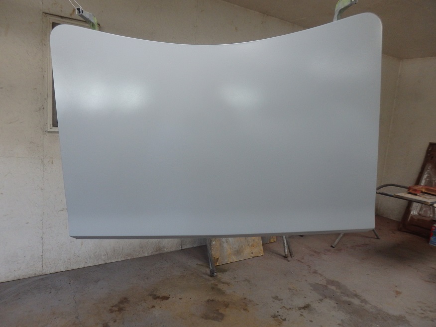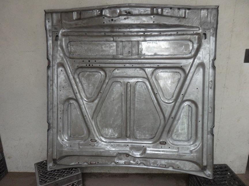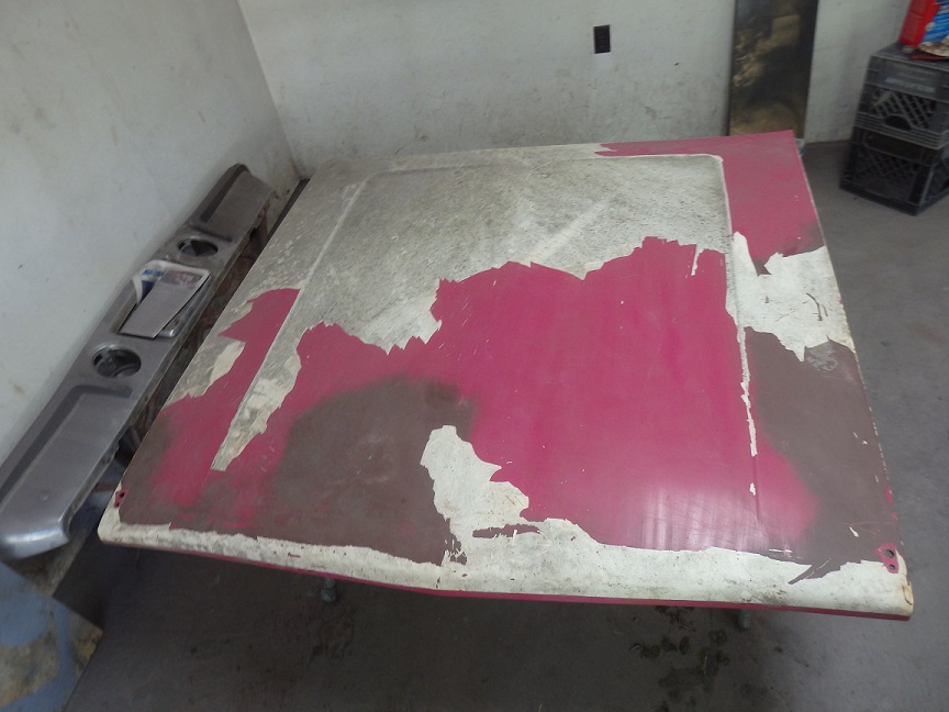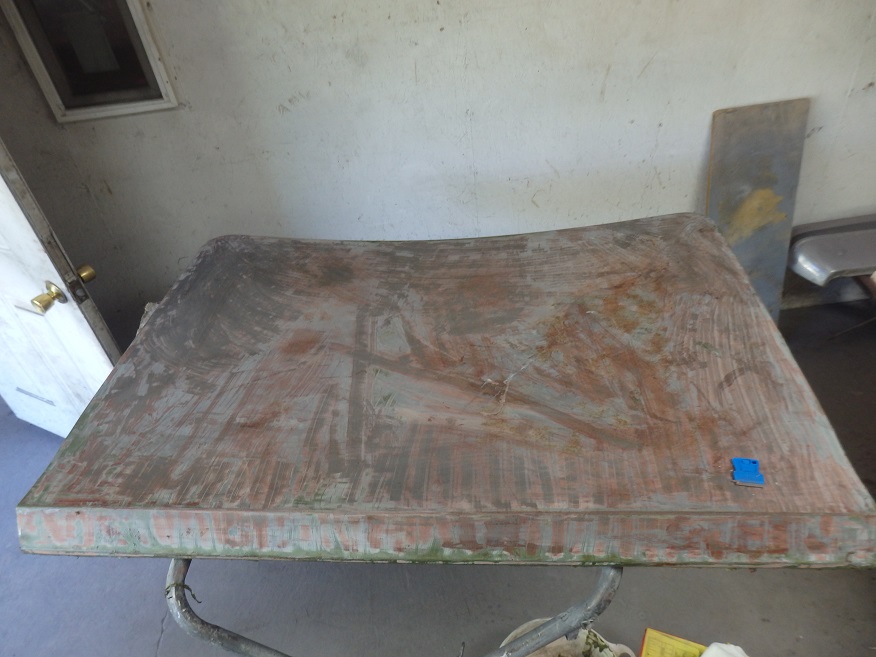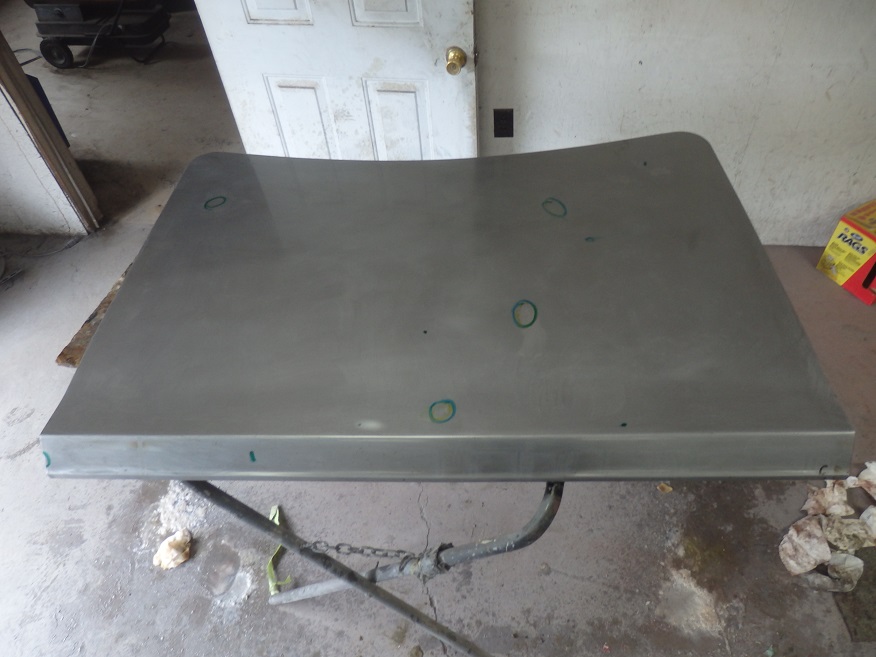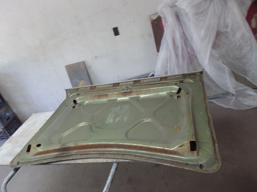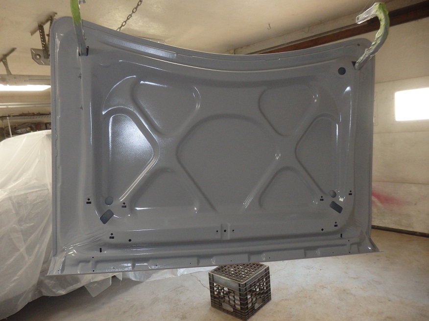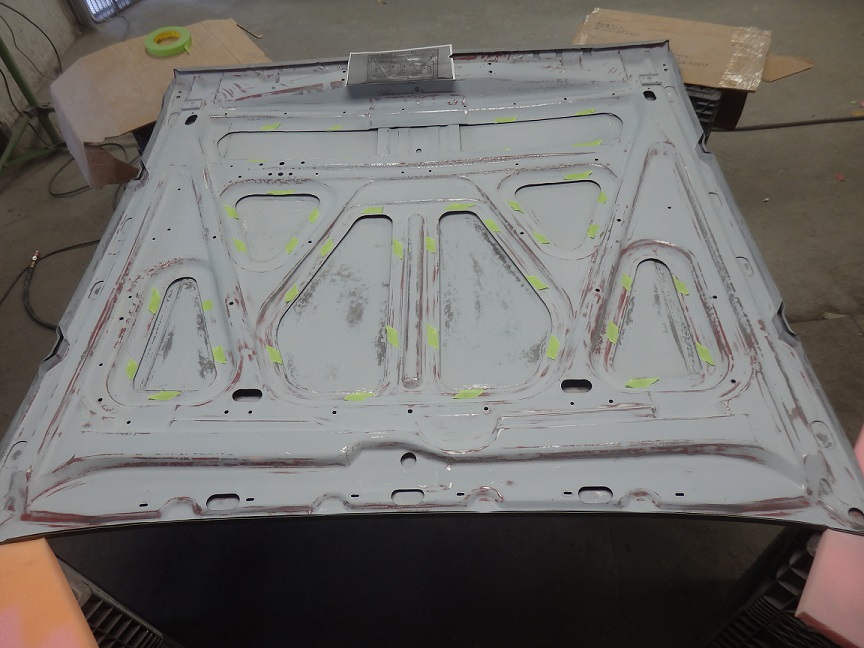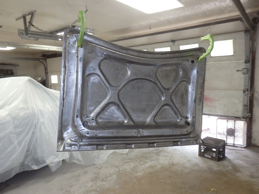 The top of the hood either suffered from where someone sat on the hood or walked across it in the junkyard. A litte filler, in a large area, and big sanding blocks were required to bring the hood back to its original flatness.