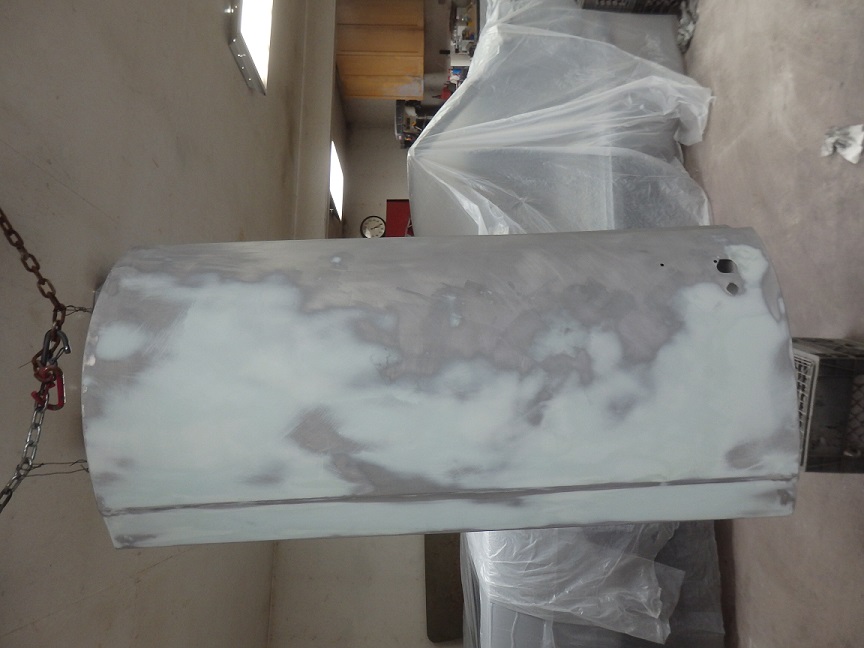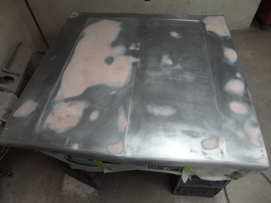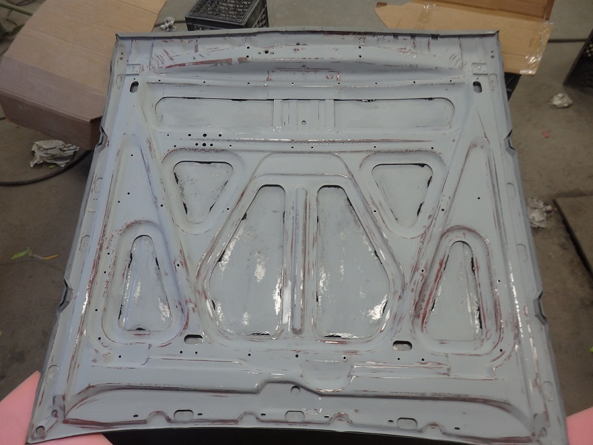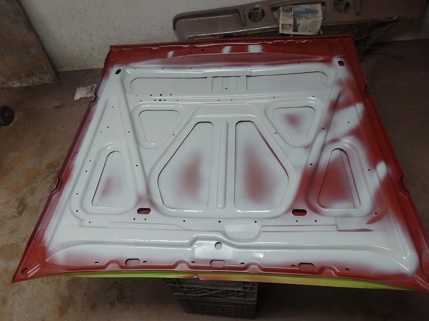 The underside of the hood had lots of rust pitting. To fix it I first coated the hood with epoxy primer (red) and the sprayed over the rust area with slicksand. After sanding it was recoated in epoxy primer (gray).