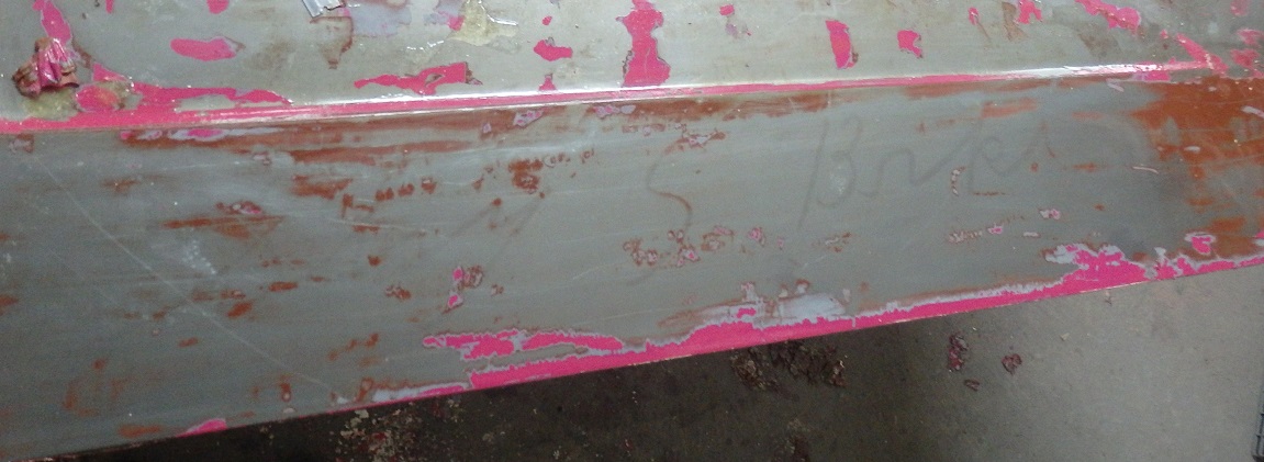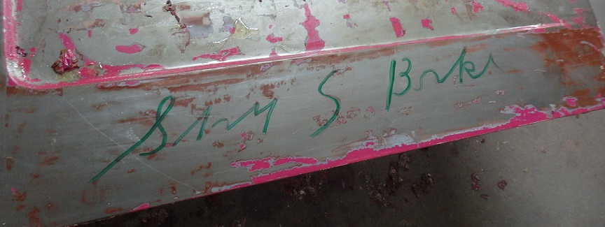 This was a suprise. Strippnig the hood revealed this factory writing. I traced over it with a marker to make it more ledgible. My best guess on what is says is "8AM S Bake".